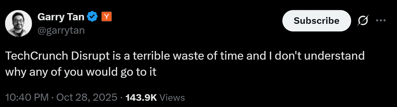 Garry Tan, director of Y Combinator, believes that the TechCrunch Disrupt event has lost its quality and is now a waste of time. He shared his opinion on his X (Twitter) account: